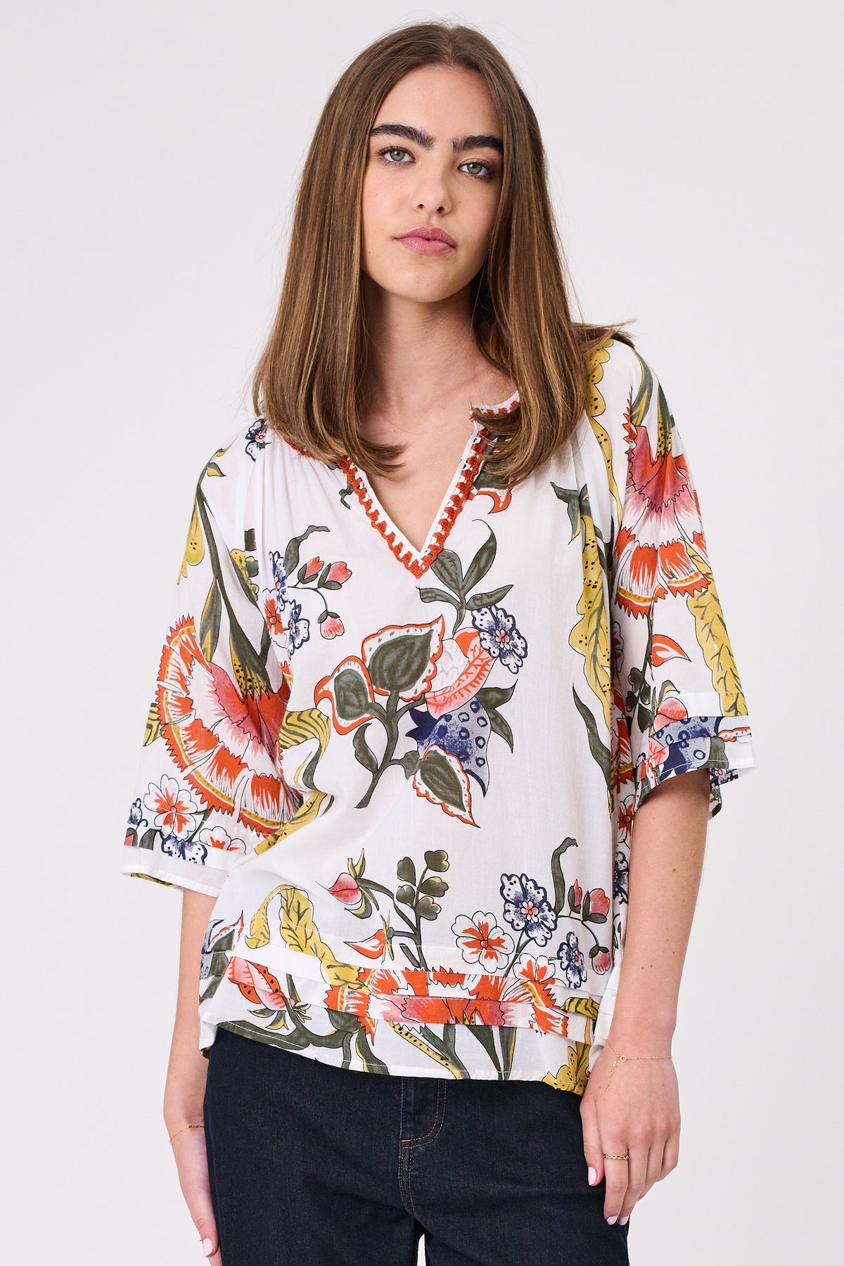 This Frankie print top is made of soft cotton fabric. Round neckline with V shape opening. Raglan armhole short sleeves with pleats detail. Lovely crochet trim at neckline and placket.