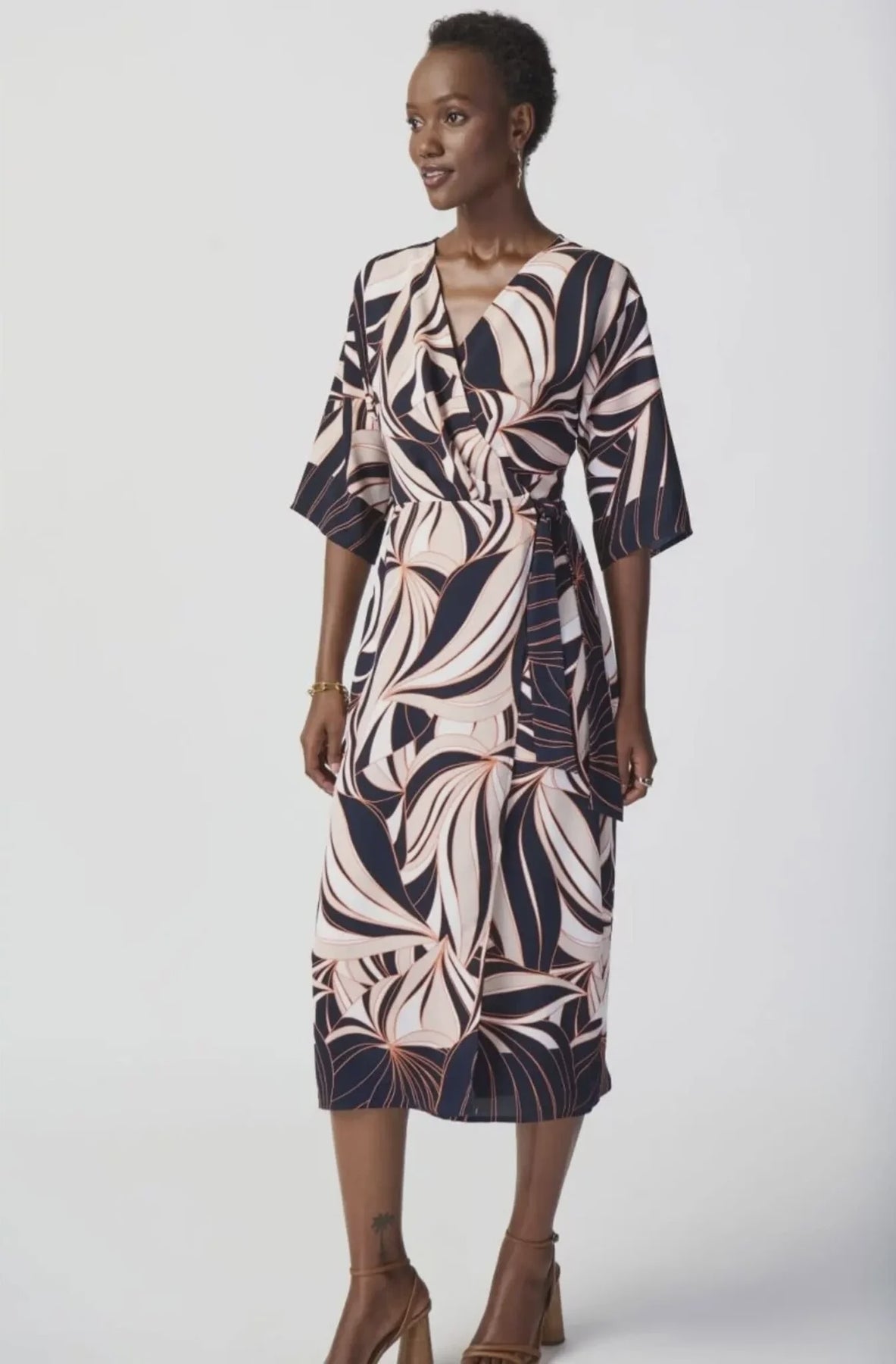A true hallmark of feminine style. This woven wrap dress showcases an alluring tropical print that can easily transition from day to night. Falling at mid-calf length, the garment is designed with side waist ties to define the silhouette and chic three-quarter dolman sleeves that add a hint of dramatic flair.
