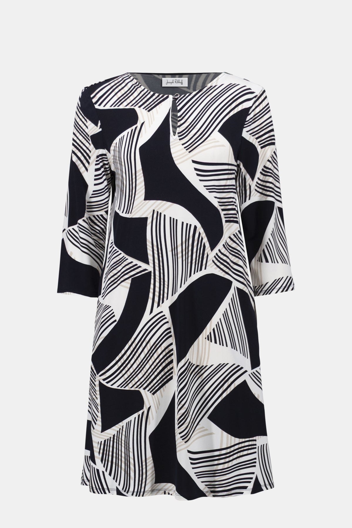 Effortless and graphic, this silky knit dress features a geometric print, keyhole neckline with button closure, side pockets, and three-quarter sleeves.