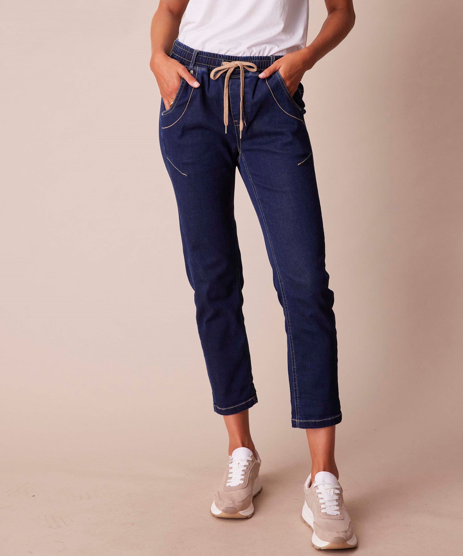 Casual jean with elasticated waist and adjustable drawstring tie. Soft handle achieved by special garment wash.