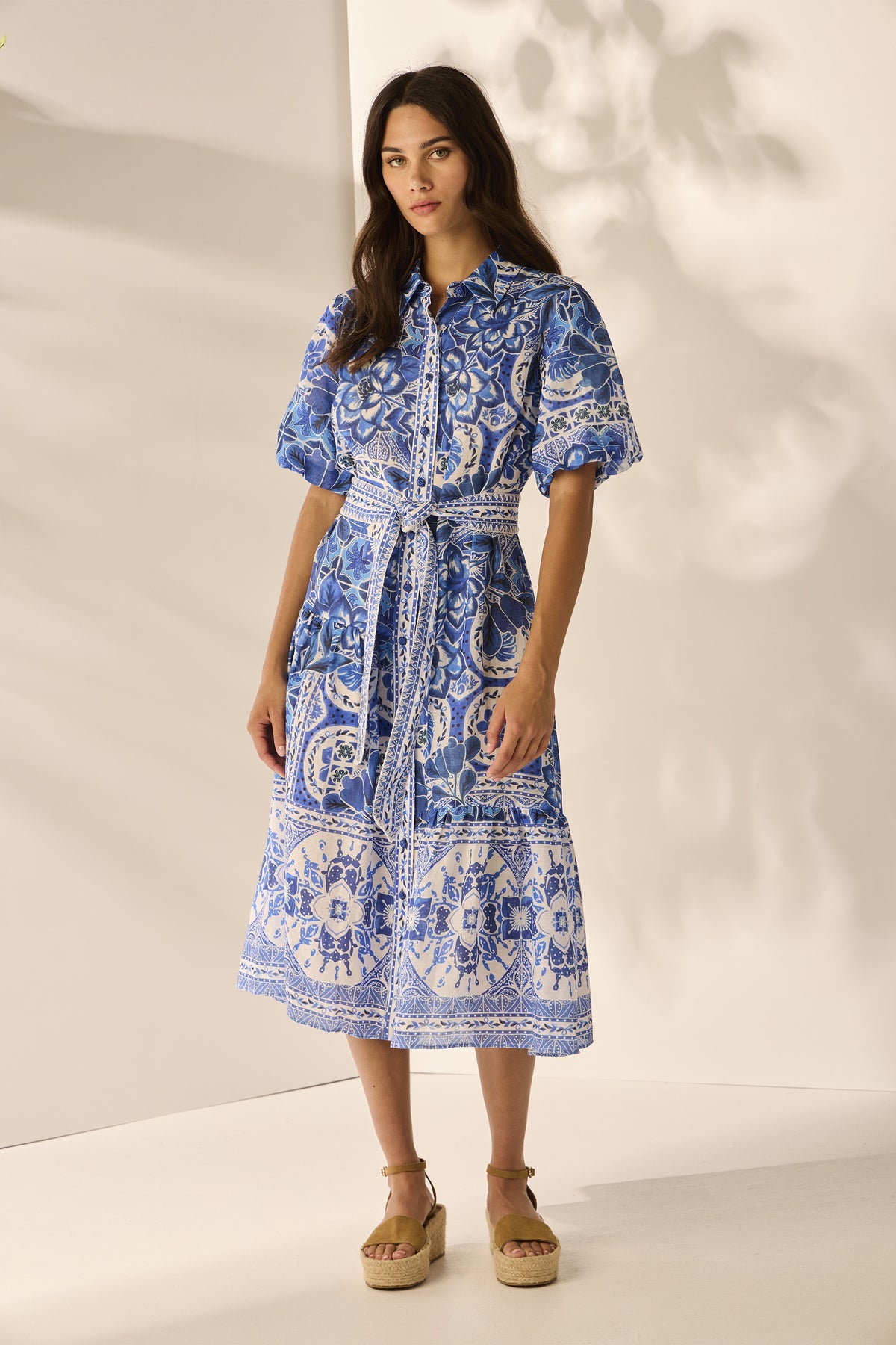 The Porto Dress is a perfect balance of elegance and artisanal charm, featuring a mid-calf length silhouette with a flowing high-low gathered hem. Thoughtful details like blanket stitch embroidery on the belt, a border print accent, and a centre-front placket with raffia buttons make this a standout piece for effortless styling.