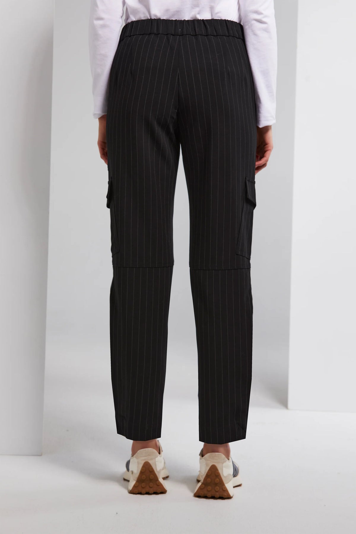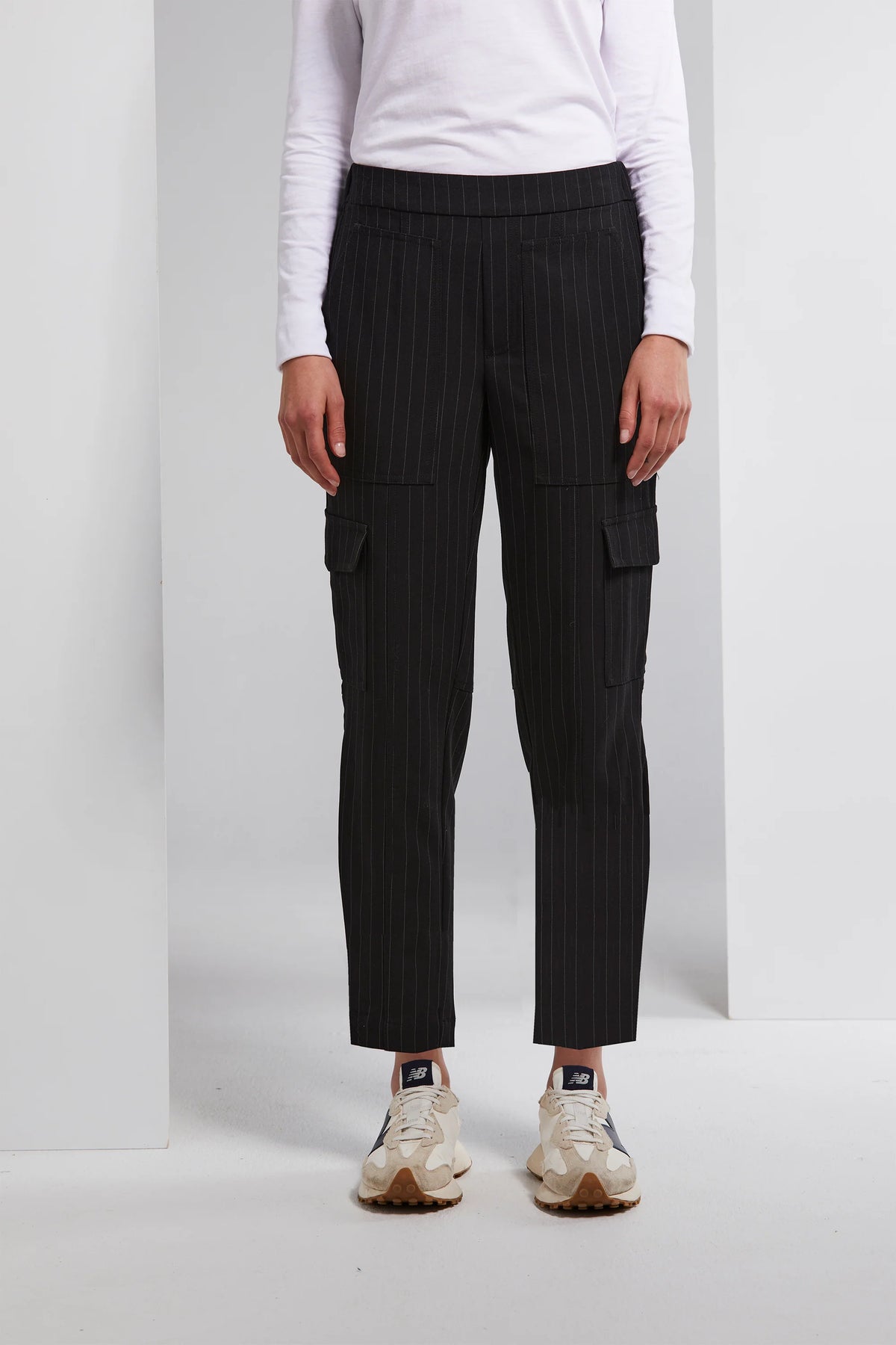 The State Pant is your key to a versatile, chic style. Crafted in a stretch striped suiting, its tapered design and elasticated waistband provide both comfort and a flattering fit. Cargo patch pocket detailing adds a touch of trendiness, while the box topstitched tuck at the outside leg hem sets it apart from ordinary pants. Designed with a faux front fly and a shaped back yoke, it's a go-to choice.