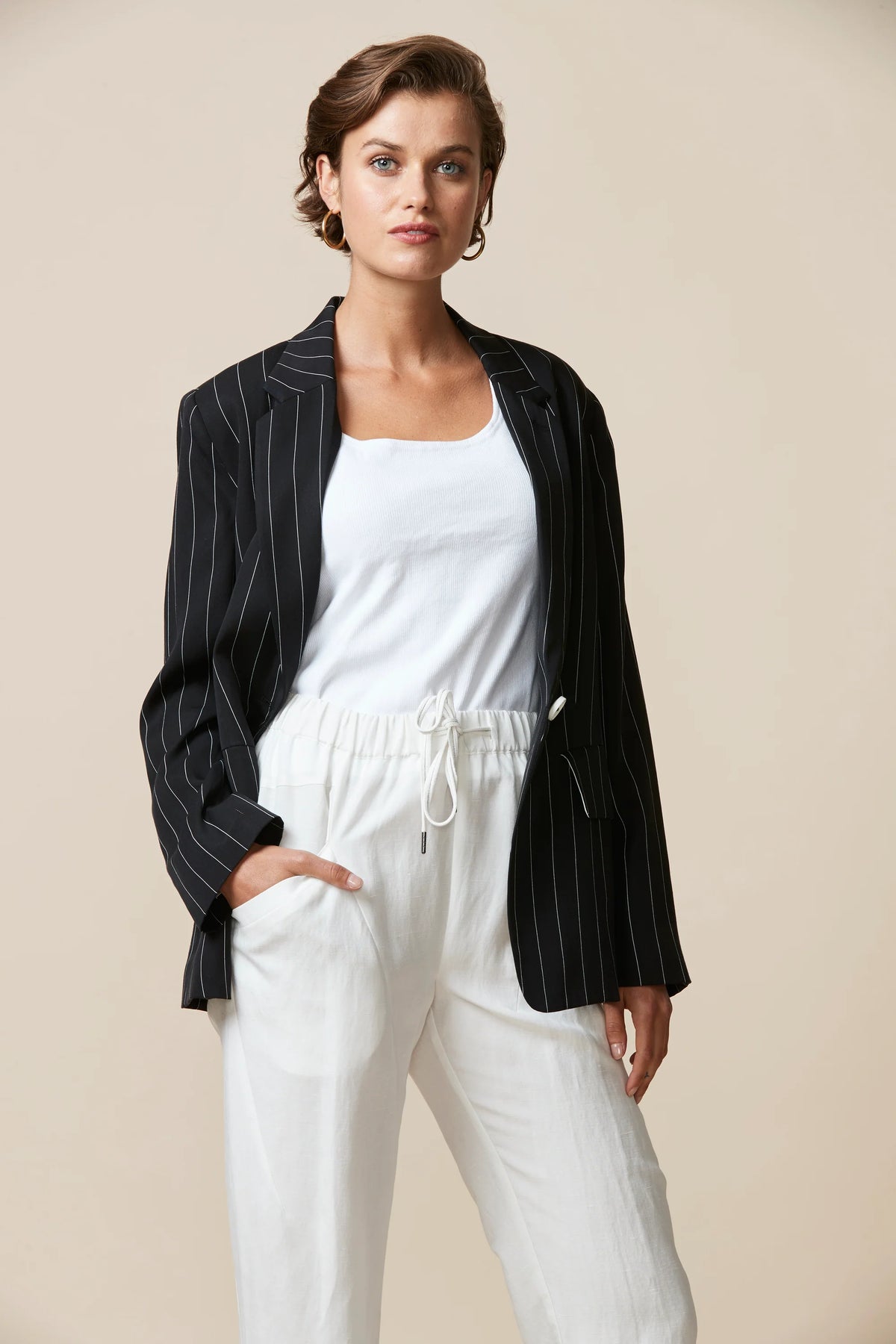 Tailored stripe jacket featuring fully functioning cuff, flap pockets, contrast lining and statement buttons. Wear as a suit with our Tram Pant, or slip on over one of our essential tees with jeans for comfort in style.
