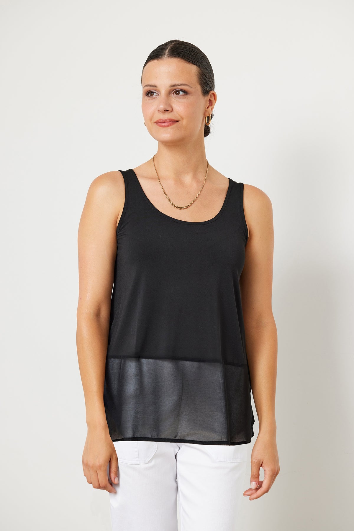 A perfect layering singlet made with a drapey knit for comfort and a sheer chiffon hem panel. This is our longer length.