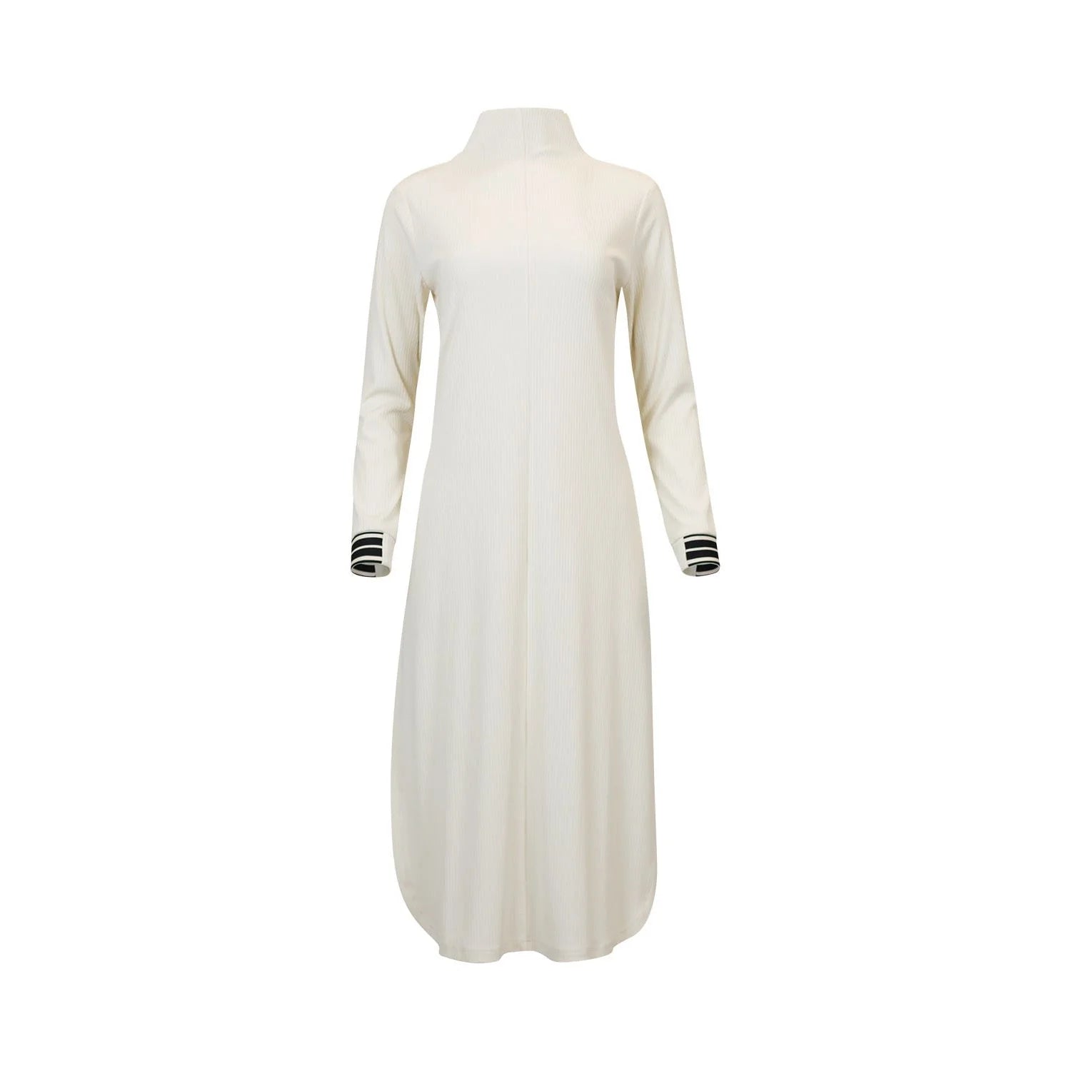 Fitted ribbed tunic, designed to be worn over skirts or pants, with high side splits for layering. Featuring striped elastic on cuffs, and back darts for a perfect fit.