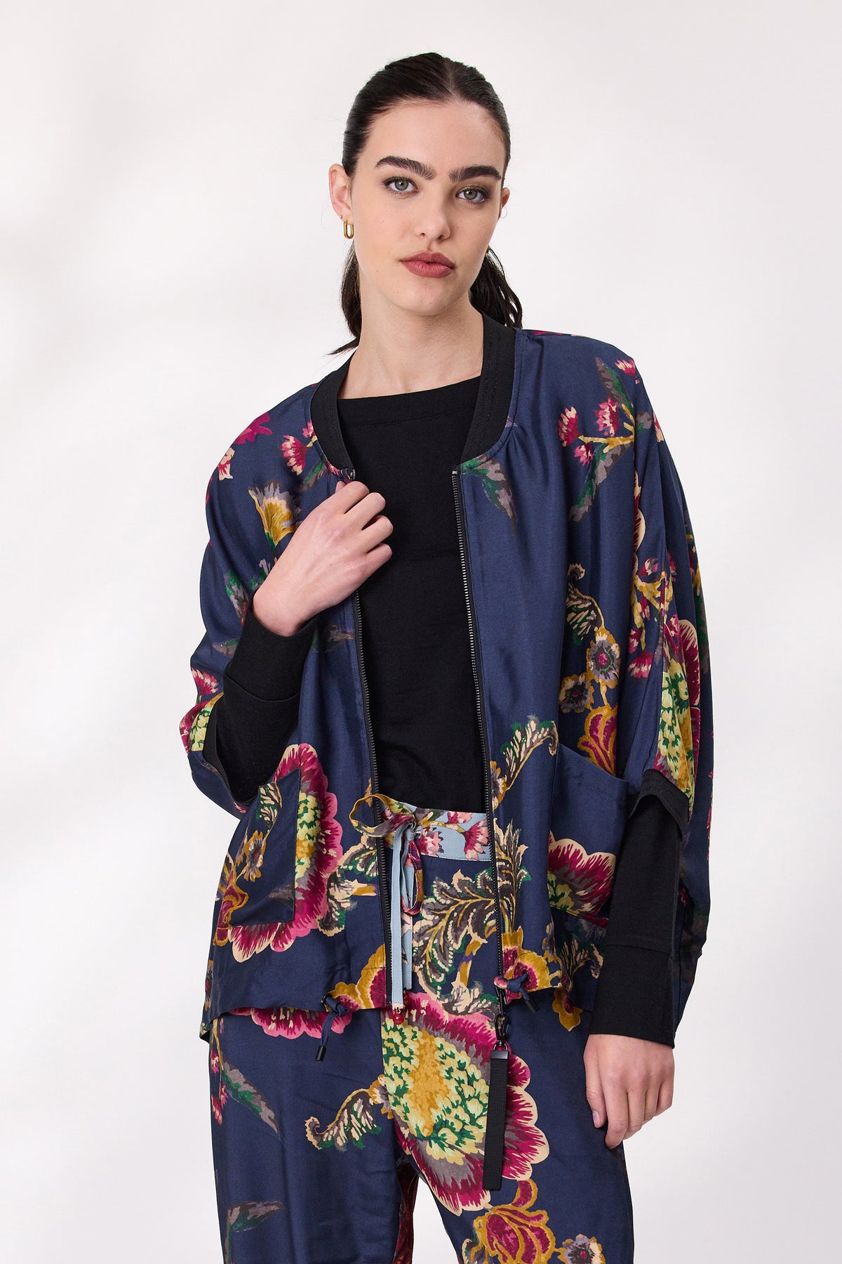 Add a touch of elegance to your wardrobe with the Bramble jacket. Featuring a vibrant print, this jacket is finished with black ribbed neck band and cuffs for a sleek contrast.The front zipper closure offers easy wearability, while side pockets provide everyday convenience.