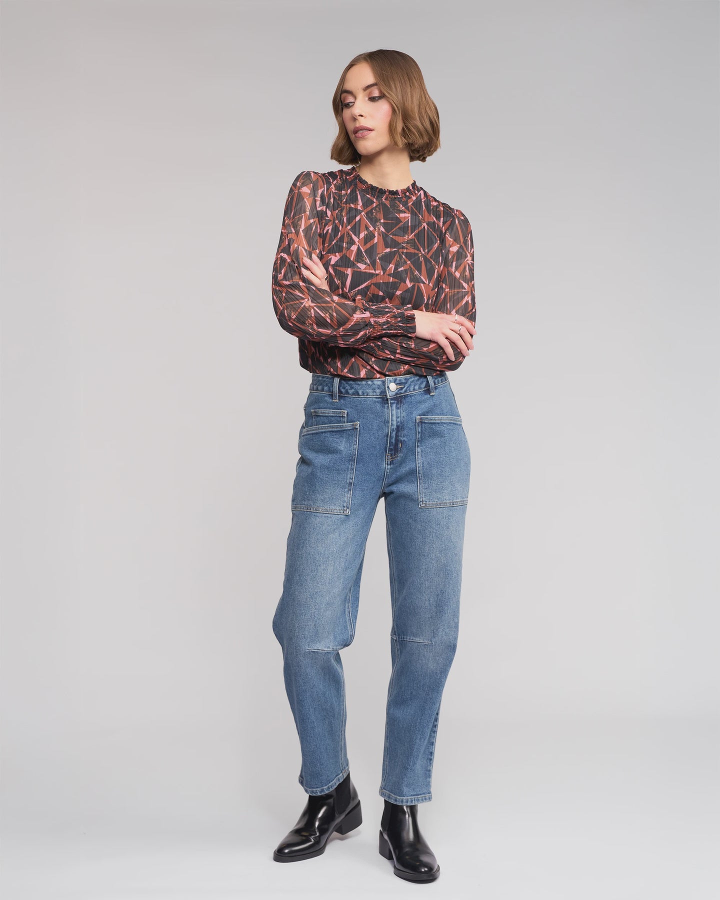 Barrel-leg ankle-grazer jean in Vintage Denim — a mid-blue wash with a softly worn finish. Shaped with knee dart detailing to create a curved silhouette, this style also features oversized front patch pockets.