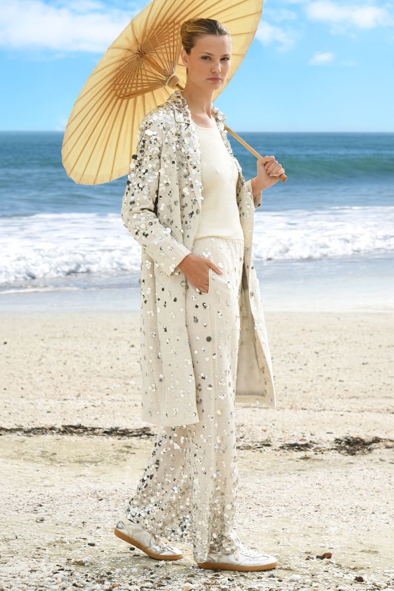 Elevated in sequin embellishments the ‘Walk and Talk’ trouser boasts luxurious eye-catching detail and texture with each and every movement. Crafted in the graduated sequin linen fabrication; ‘Glow with the Flow’ these wide legged trousers offer a comfortable elasticated waist, side pockets, and have sequins and beads detailing both front and back. Pair with your favourite heels, this statement piece is an absolute head turner from office to dinner.