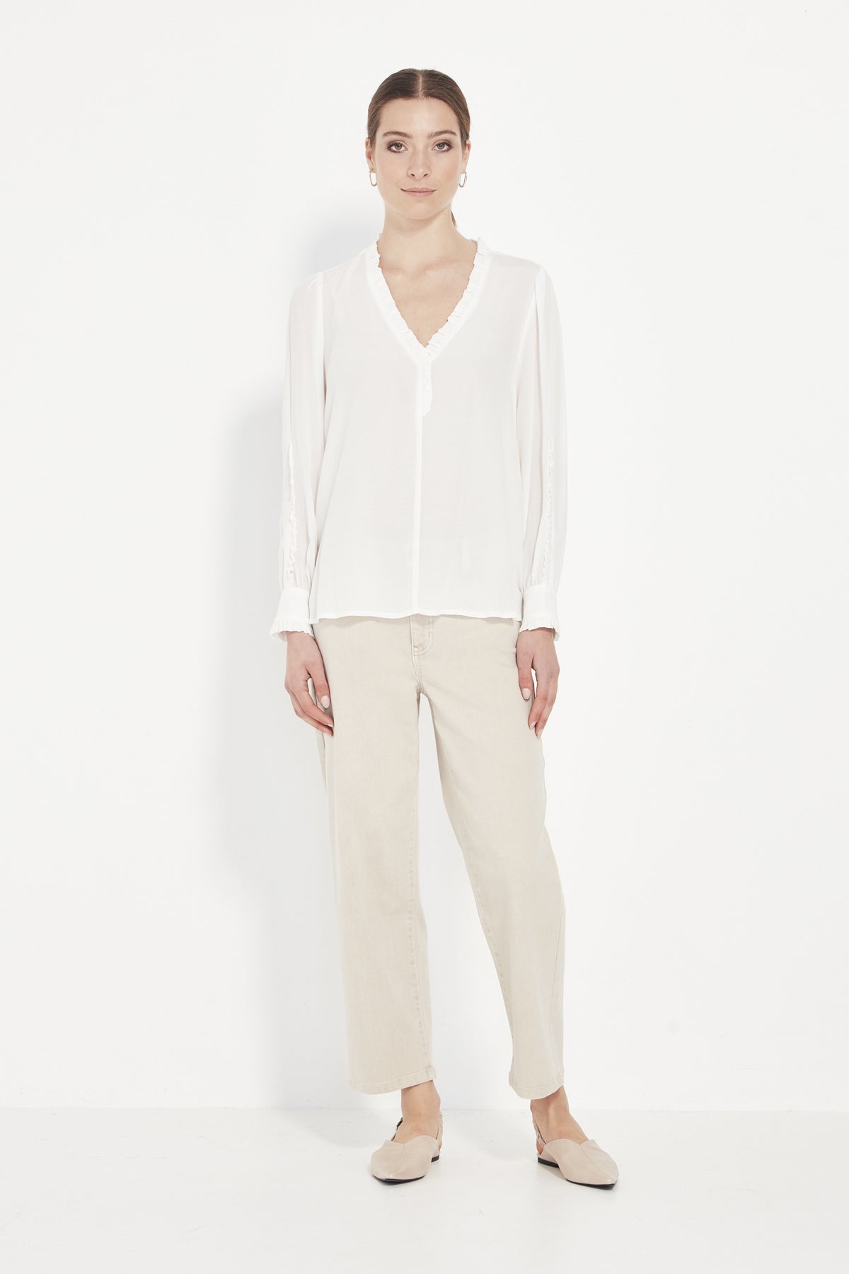 The Cascade Blouse is crafted from a soft drape Viscose/Rayon blend, giving the silhouette beautiful movement and a smooth, feminine fall. Designed with delicate frill detailing along the V-neckline, sleeves, and cuffs, it brings gentle romantic texture without feeling overly fussy.