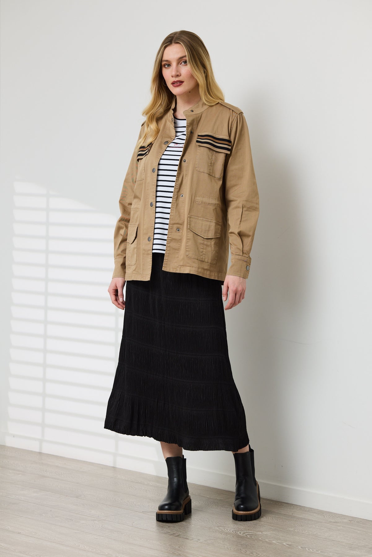 Stretch Cotton twill jacket with brushed finish and epaulettes at shoulders. It features a snap dome front closure for easy wearing. The jacket also has chest pockets with stripe tape detailing and an internal waist tunnel with a bungee cord adjustor for a customized fit. Additionally, there are patch pockets below the waist and snap dome cuff closures for added style and functionality.