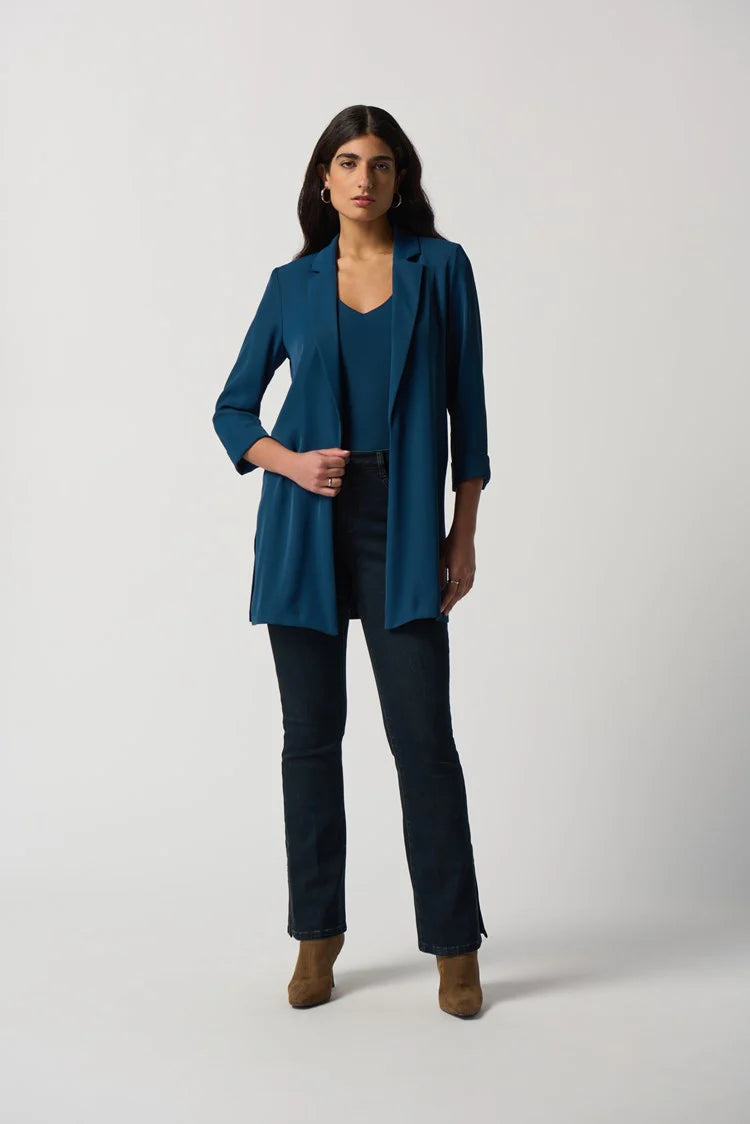 Add a touch of soft tailoring to your outfit with a longline blazer. The flowy matte twill fabric with a side slit creates a relaxed feel, while the notched collar and three-quarter cuffed sleeves provide structure to this modern blazer.
