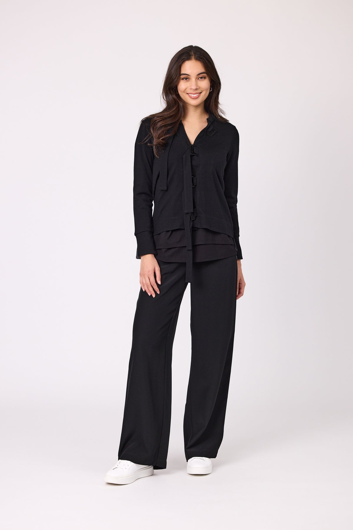 Long sleeves cardigan. It has metal buckle and ties at front opening.