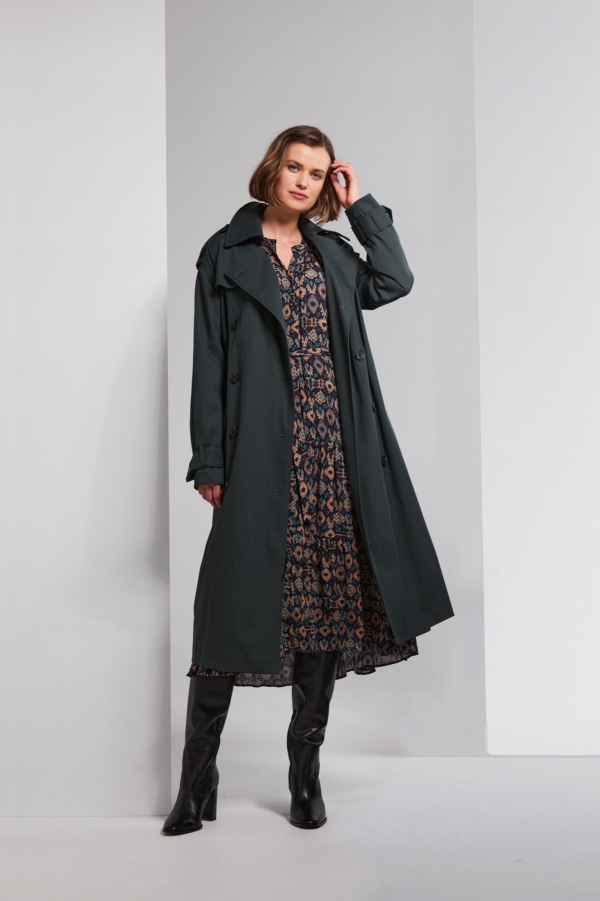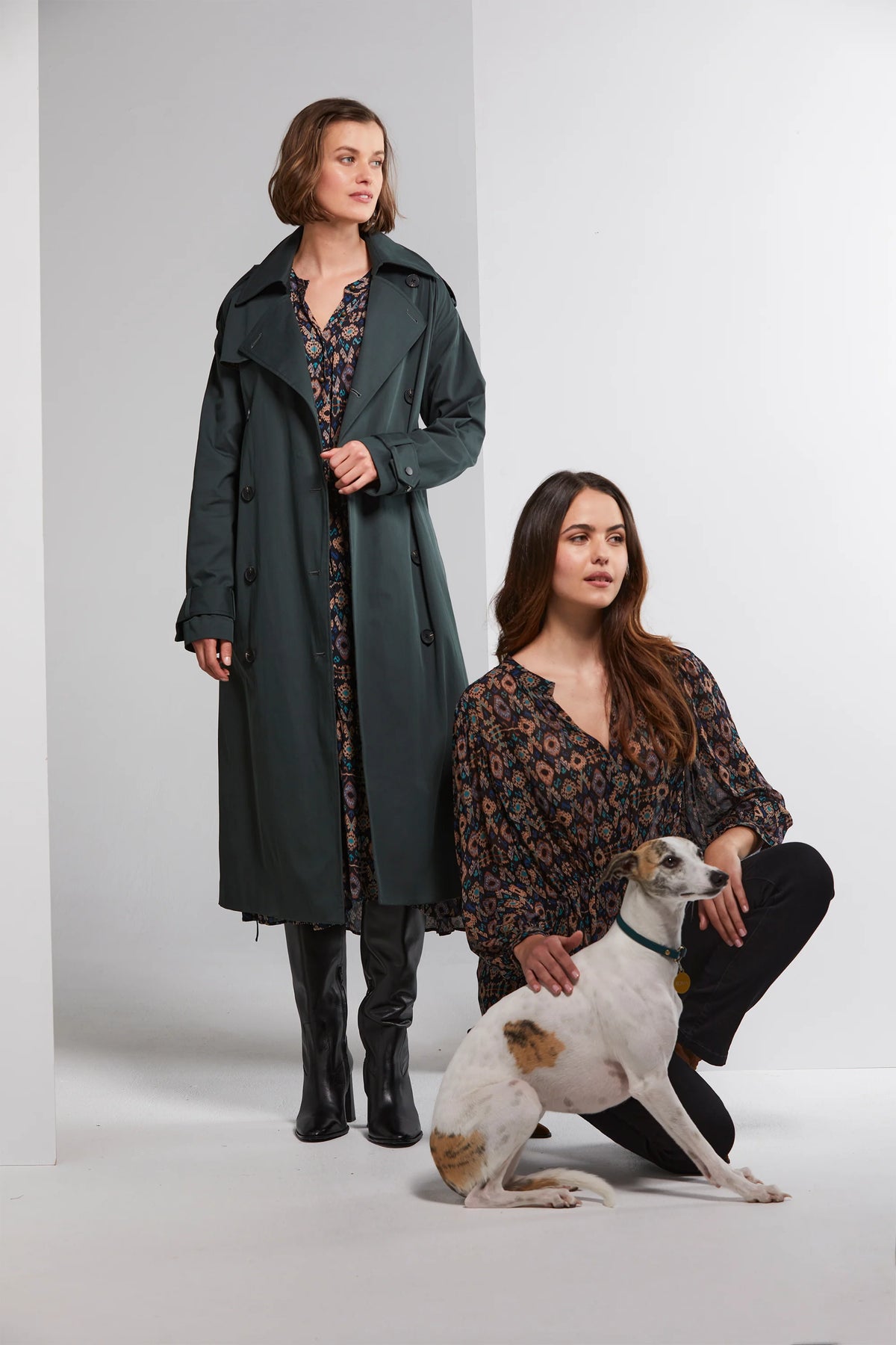 Step into classic sophistication with the Rail Trench, a longline coat that's right on trend. It features a double-breasted button front adorned with dark tortoiseshell buttons, exuding timeless charm. The buttoned buckle detail at the cuff adds a touch of refinement. Whether you drape it over a dress or casually pair it with jeans, the Rail Trench is a versatile addition to your wardrobe. Crafted from a blend of 61% Rayon, 35% Nylon, and 4% Elastane, it ensures both style and comfort.