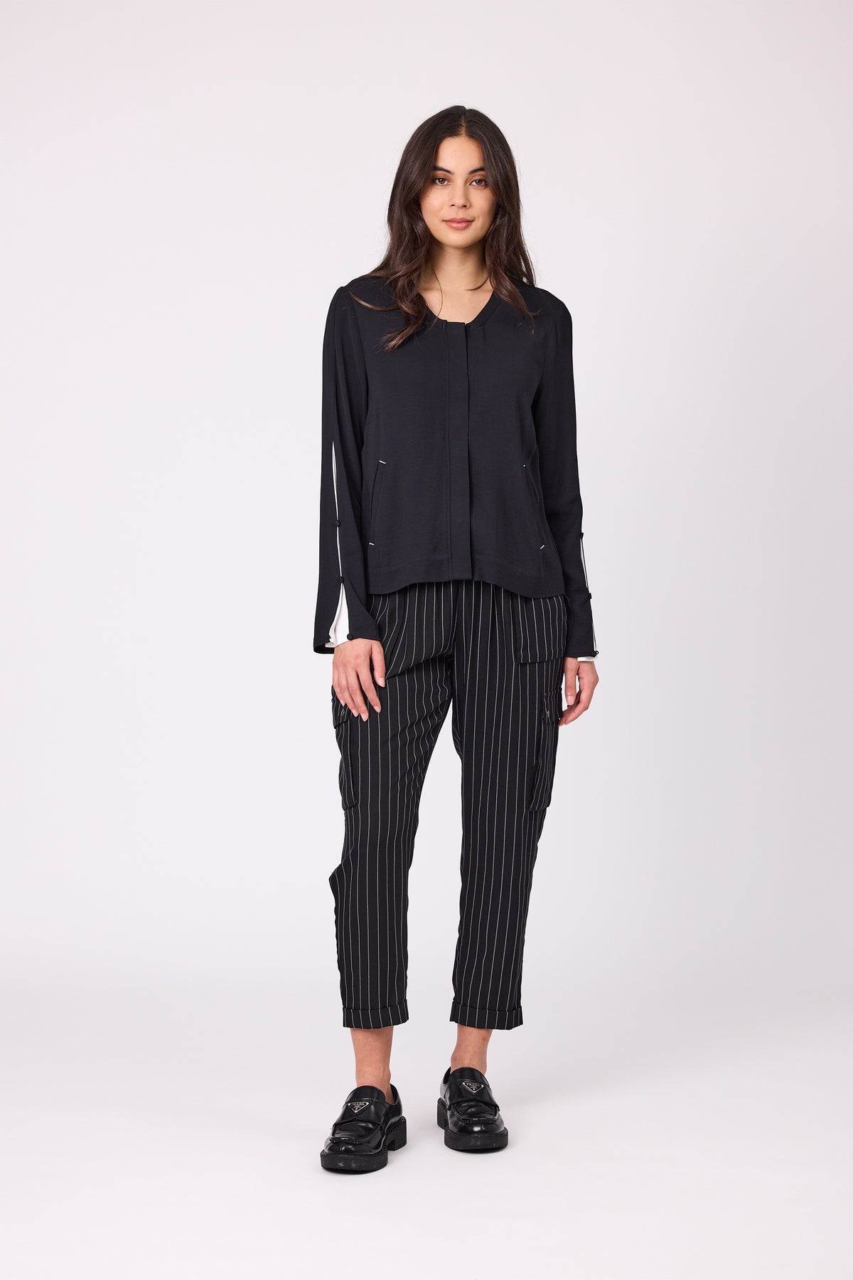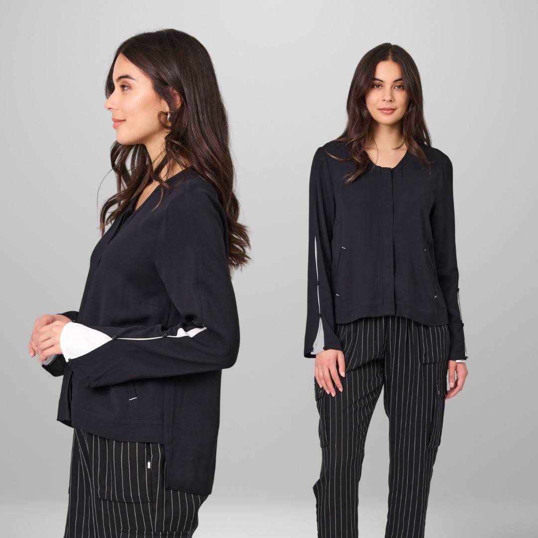 Long sleeves short length jacket. Hidden snaps front placket opening. It has contrast inset panel at sleeves with self fabric covered buttons details.