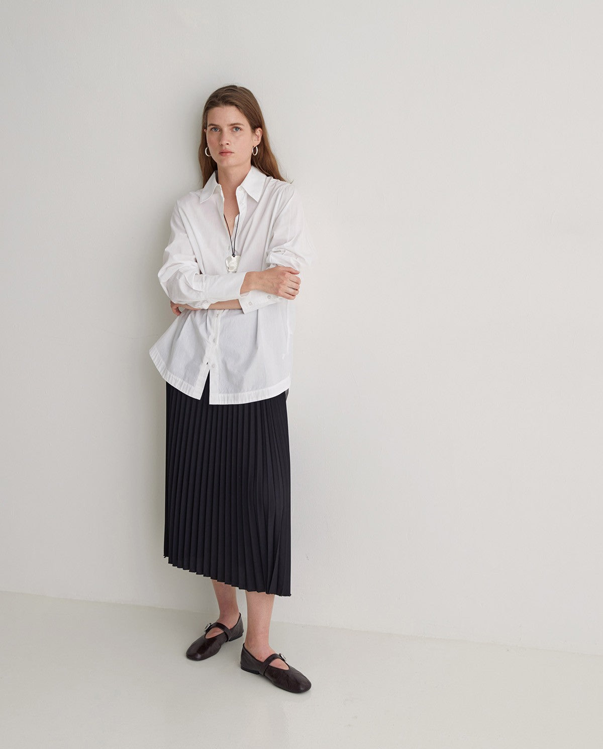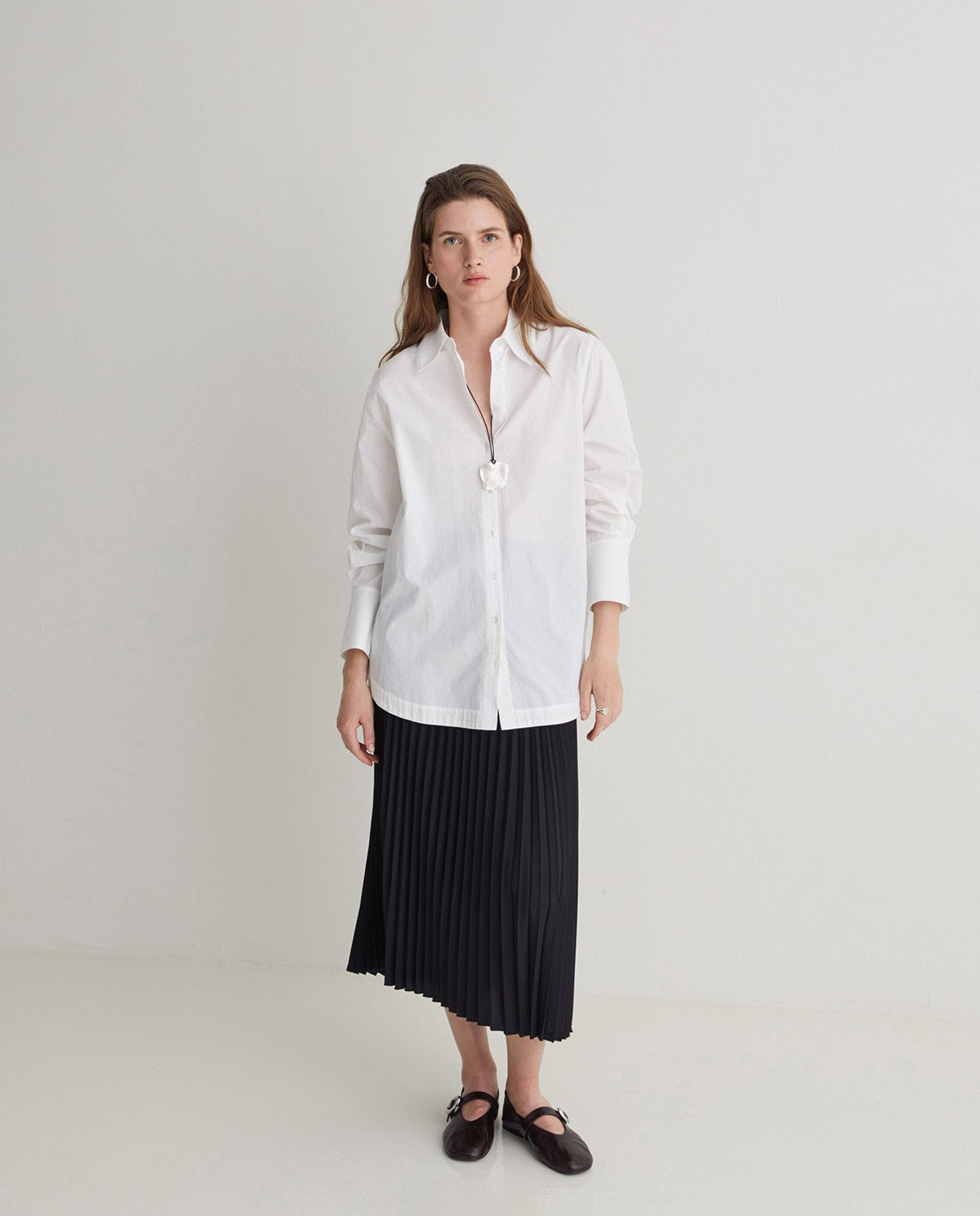 Crafted from pure cotton, this oversized shirt embodies effortless elegance with its generous silhouette and refined details. The classic collar and extended sleeves are finished with mother-of-pearl buttons and adjustable button cuffs for a polished look. A subtle pleat at the back adds dimension and movement, making it an understated essential for any wardrobe.k.