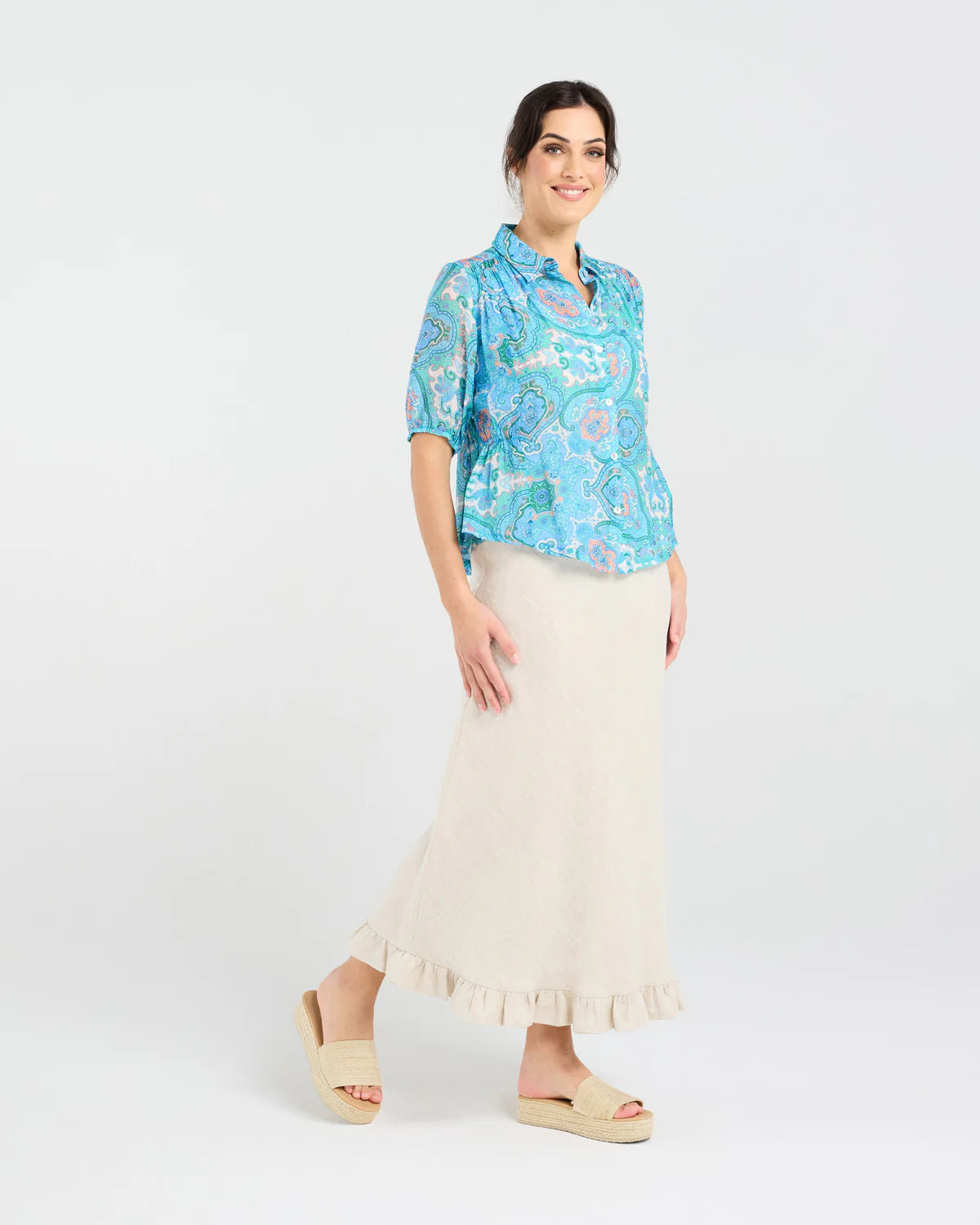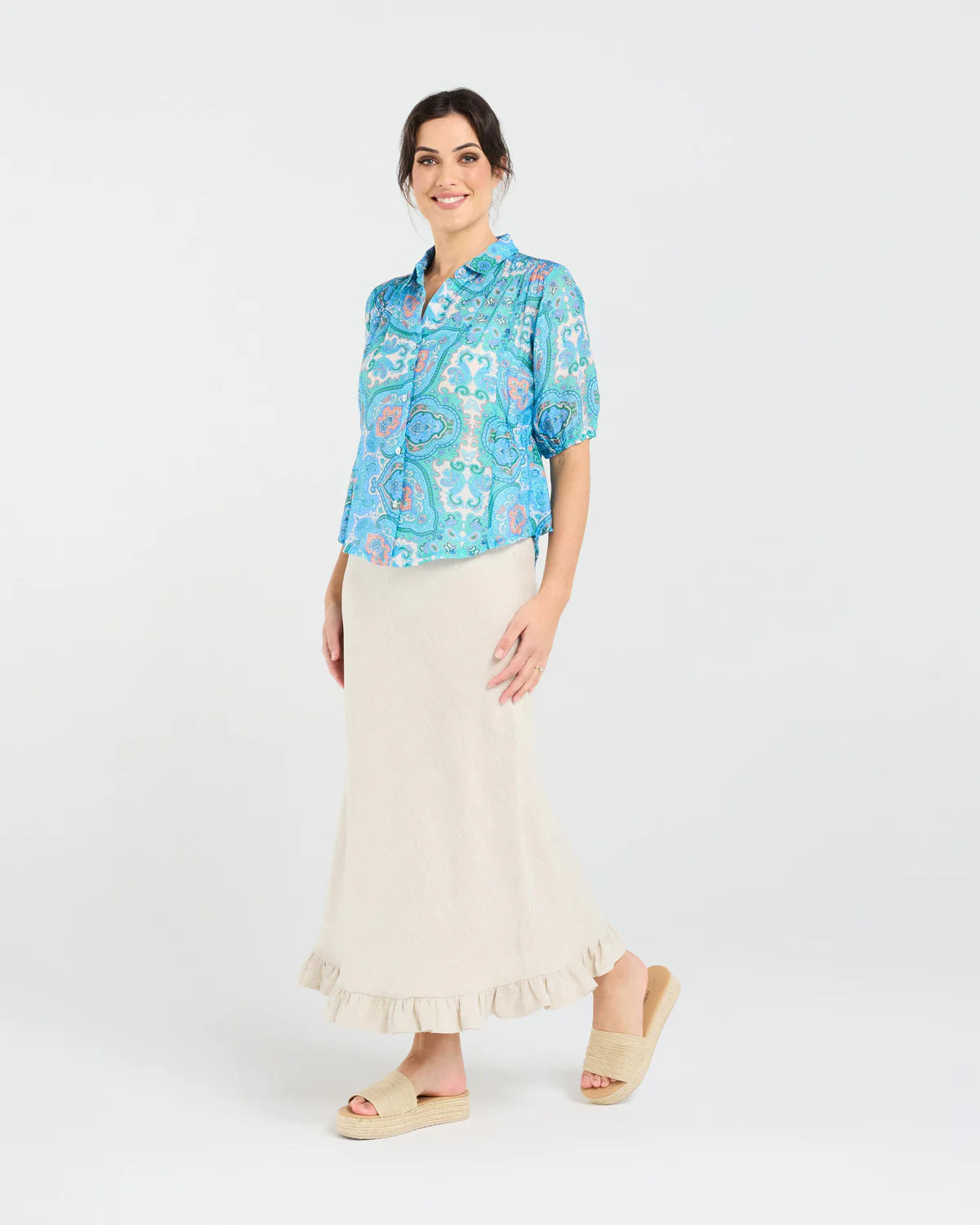Introducing the Darrell Gathered Waist Shirt from Blackstone. Crafted from a premium mix of rayon and nylon, this shirt elegantly combines breathability with durability. Its unique gathered waist design cinches subtly, offering a flattering silhouette that transitions effortlessly from office hours to evening socials. The beautiful mosaic design brings a pop of colour to any ensemble, perfect for the modern professional who doesn't compromise on style or comfort.