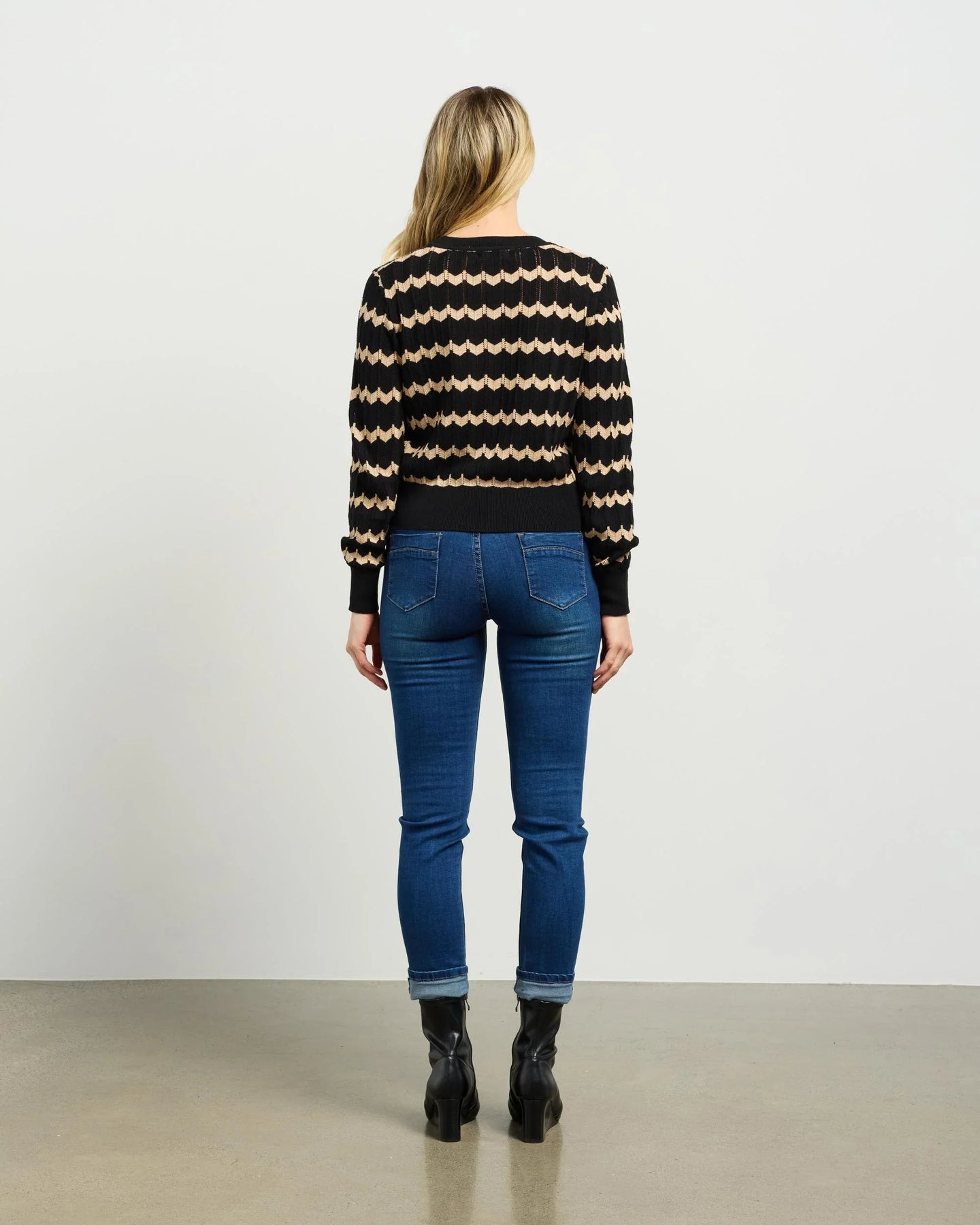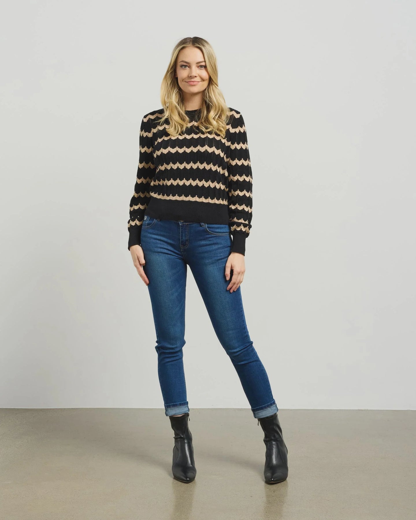 Elevate your everyday wardrobe with this sophisticated knit that balances playful design with refined elegance. The striking black and gold lurex zig-zag pattern, accented with delicate stripe detailing, creates visual interest without compromising versatility. Crafted from a lightweight cotton-blend fabric, this fully fashioned piece features a round neckline, long sleeves with ribbed cuffs.