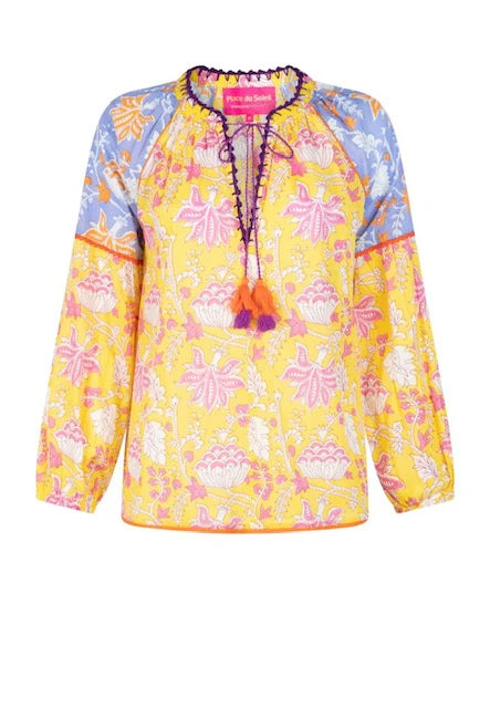 The Place du Soleil Lila Print Top offers a laid-back fit crafted from light fabric, accented with contrasting embroidered panels, playful front tassels, and full-length sleeves with detailed embroidery at the cuffs.