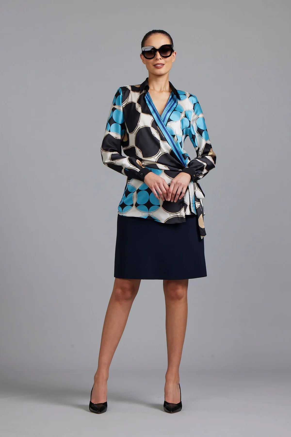 This print is delightfully French. The wrap over front adds a clean line to the placement print. Worn with slim-line pants or pencil skirts, either way it's just divine