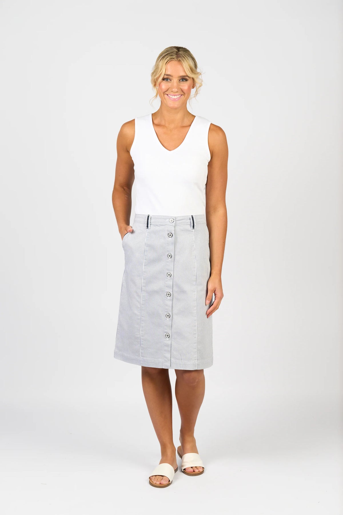 A knee length skirt in an ink and white stripe, made from a cotton-elastane blend for a comfortable stretch fit. Featuring contrast buttons down the front and contrast trim details.