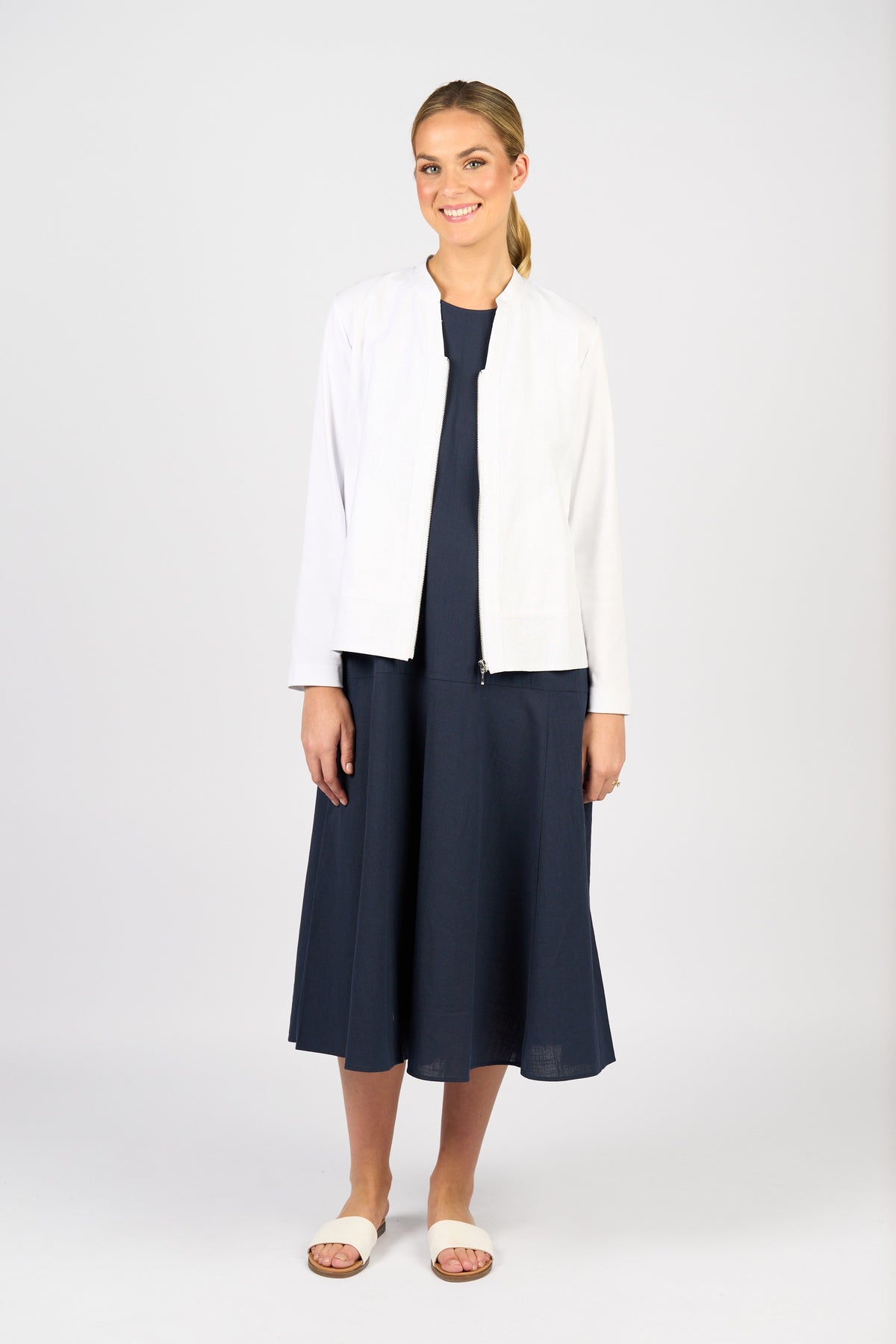 This zip-up jacket features stretch cotton-elastane panels on the sleeves, sides, and back for added flexibility and comfort. Lined with 100% cotton, it combines structure with ease for everyday layering.