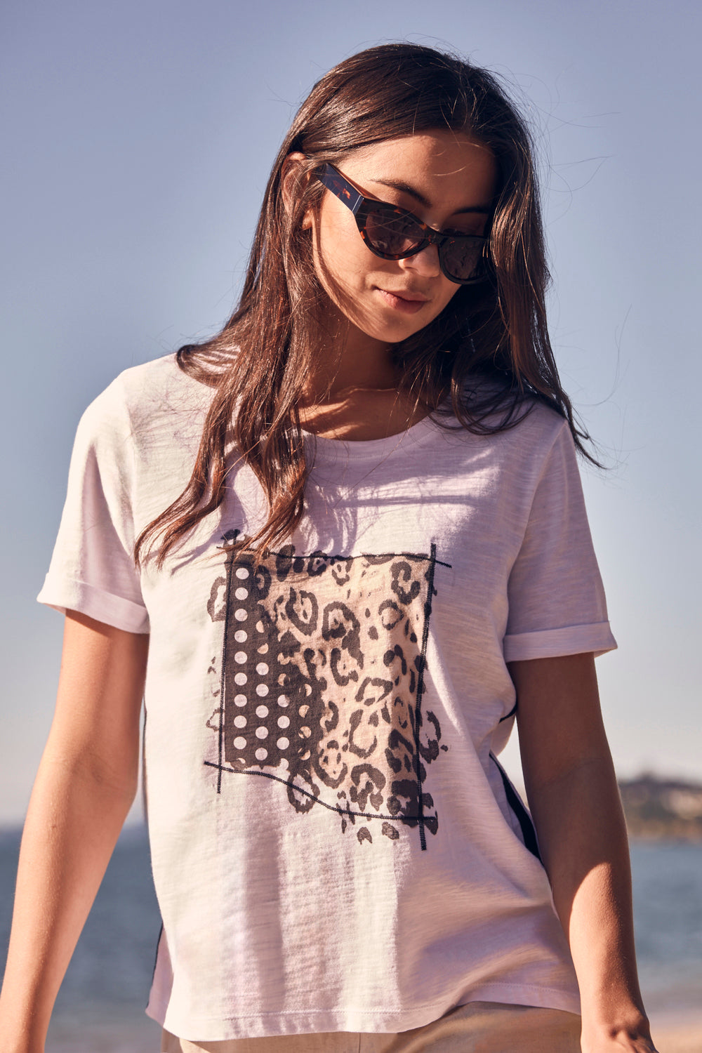 The Dusty Top is a fresh take on the everyday tee, crafted in 100% cotton with a modern animal-inspired placement print and subtle embroidered frame the print. Featuring a crew neckline and sleeves that fall to the mid-upper arm with rolled self-fabric cuffs, it strikes the perfect balance between casual and considered. Contrast black herringbone tape runs down each side seam for a sporty, directional twist. Finished with a curved hemline that falls below the hip, the Dusty Top is a versatile layer that elevates off-duty styling with ease.
