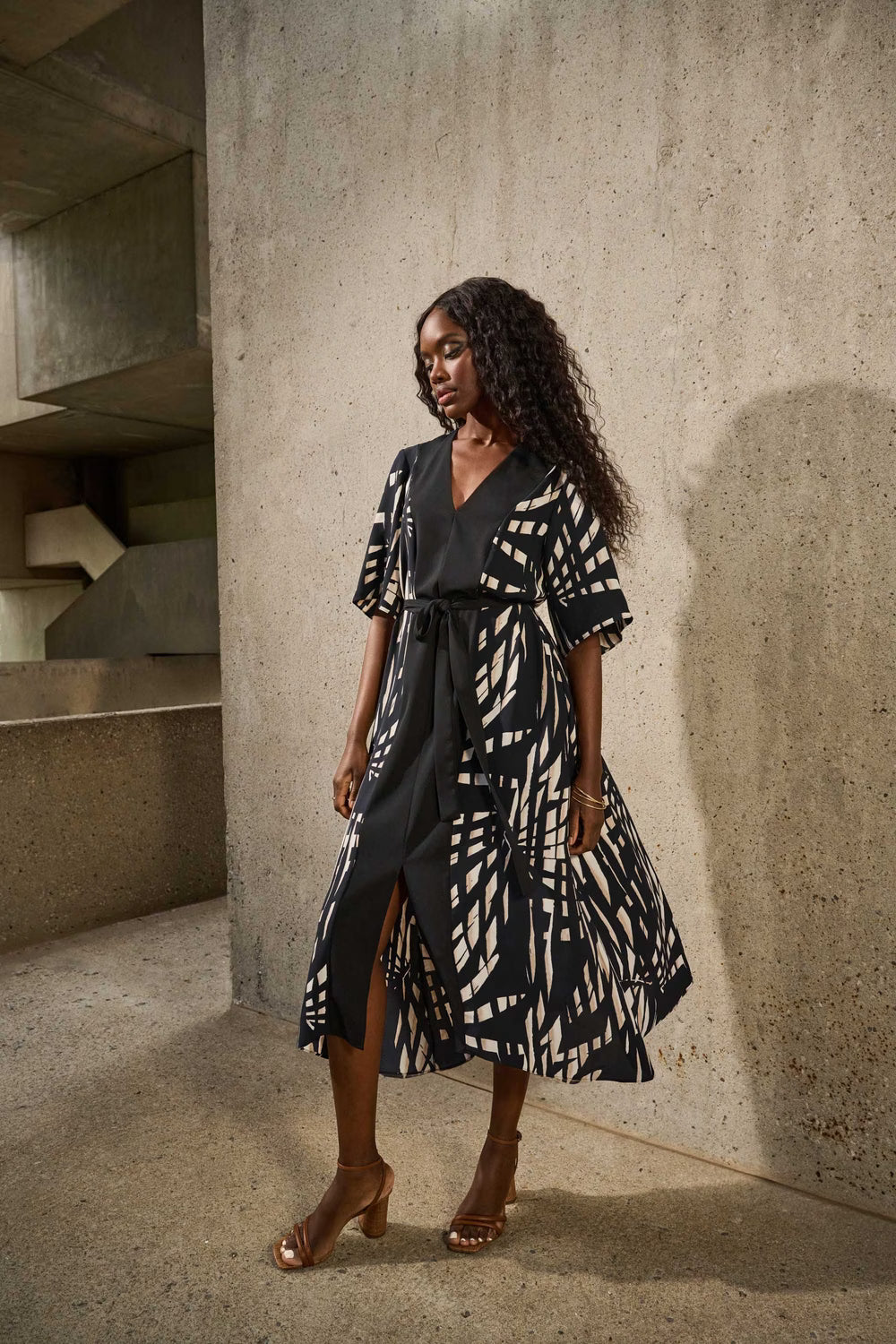 A masterclass in timeless charm and poise, this lux twill dress will have you stepping out in style wherever you go. The piece features chic short bell sleeves, a sleek V-shaped neckline and an exquisite A-line silhouette exuding incomparable dramatic flair. The contrasting band inserts at the front and delicate sash belt pair beautifully to accentuate the design’s unique appeal.