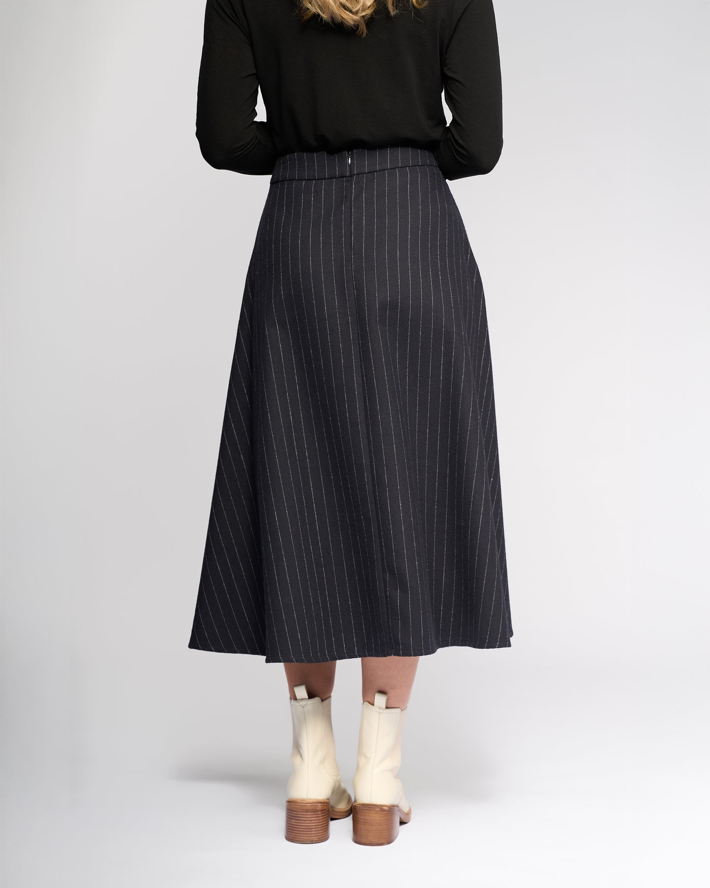 Midi-length skirt in our Ink Stripe fabric — a dark navy base with fine white pinstripes. Made from a warm wool-blend fabric, this style offers a structured yet fluid silhouette with a dressy finish, ideal for cooler months.